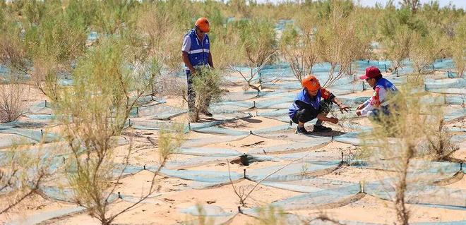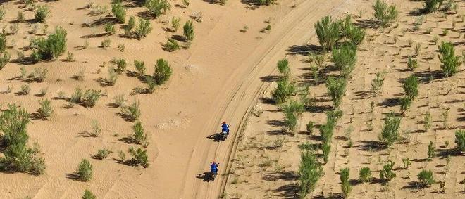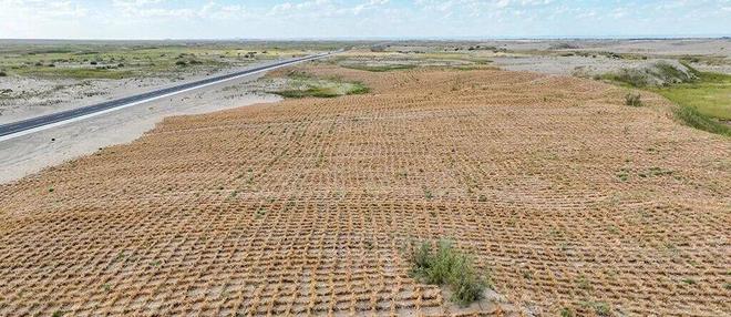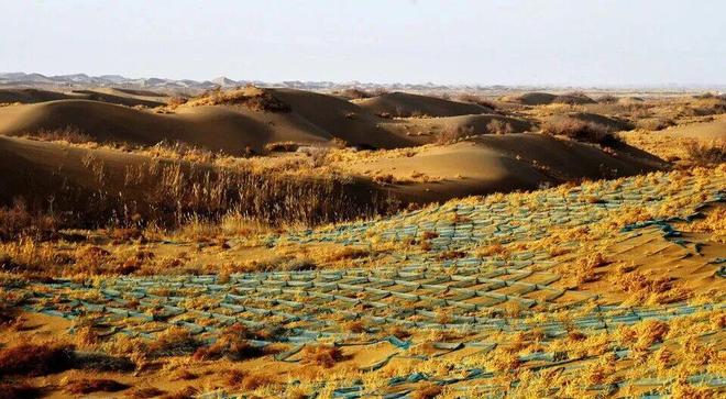 (2)典型模式:草方格沙障 + 灌木/乔木套种,如宁夏沙坡头的花棒、柠条、沙蒿等。